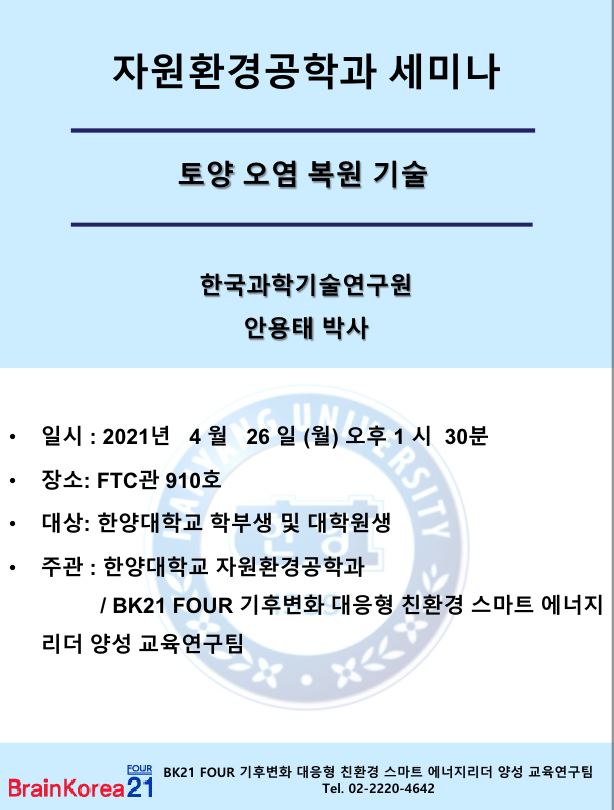 주관 : 한양대학교 자원환경공학과/BK21 FOUR 기후변화 대응형 친환경 스마트 에너지 리더 양성 교육팀