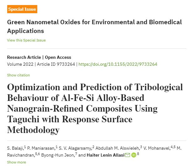 2022 | - | Green synthesis of metalloid nanoparticles and its biological applications | FRONTIERS IN CHEMISTRY | SCIE | 2296-2646 | - | 10 | - | - | 202209 | 1 | 8 | - | Roy, Arpita | - | - | Byong-Hun Jeon | - |
